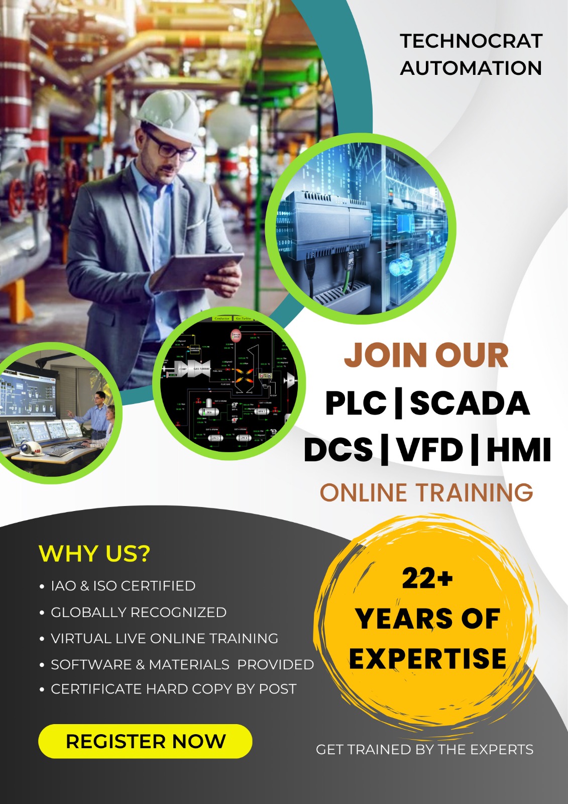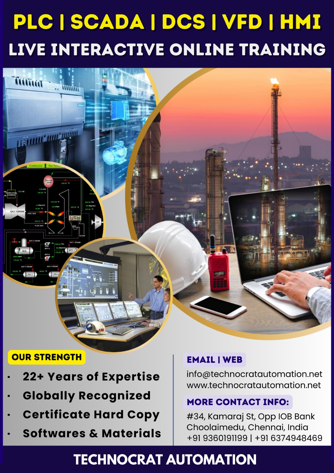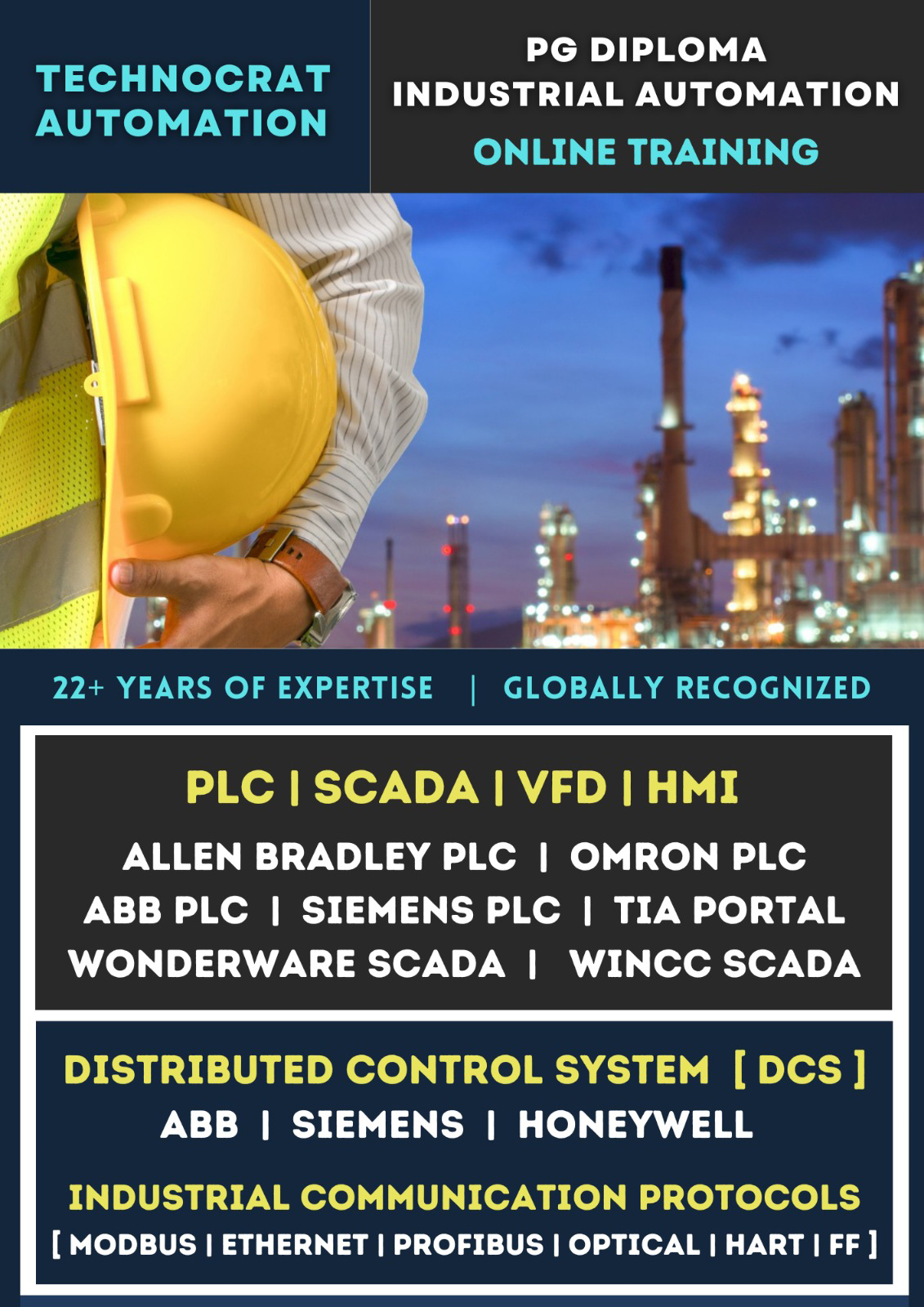 We Technocrat Automation have 22+ Years of Expertise in the Field of Advanced Industrial Automation Training. Each Course has been Designed to meet the Demand of Global Standards. Our Core areas of Advanced Training Includes PLC | SCADA | DCS | VFD | HMI | INDUSTRIAL COMMUNICATION PROTOCOLS